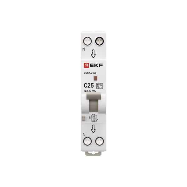 Автоматический выключатель дифференциального тока АВДТ-63 EKF PROxima представляет аппарат, сочетающий функции автоматического выключателя с электромеханическим или электронным УЗО. При обнаружении автоматическим выключателем в защищаемом участке сети тока утечки (повреждения) на землю или сверхтока (тока перегрузки иликороткого замыкания) происходит срабатывание устройства, приводящее к отключению защищаемой сети. Возможна коммутация алюминиевым и медным проводником.Автоматический выключатель дифференциального тока малогабаритный АВДТ-63М EKF PROxima представляет аппарат, сочетающий функции автоматического выключателя с электронным УЗО типа АС в компактном корпусе шириной один модуль. При обнаружении автоматическим выключателем на защищаемом участке сети тока утечки (повреждения) на землю или сверхтока (тока перегрузки или короткого замыкания) происходит срабатывание устройства, приводящее к отключению защищаемой сети. Особое отличие дифференциальных автоматических выключателей EKF с электронным УЗО – в наличии блока защиты от перенапряжения. Возможна коммутация алюминиевым и медным проводом.