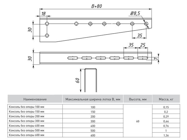 Консоль без опоры является облегченной версией монтажного кронштейна и применяется для малых и средних кабельных нагрузок. Монтаж осуществляется только совместно с профилями pp35120-1,5 (длина 120 мм.) или pp35180-1,5 (длина 180 мм).