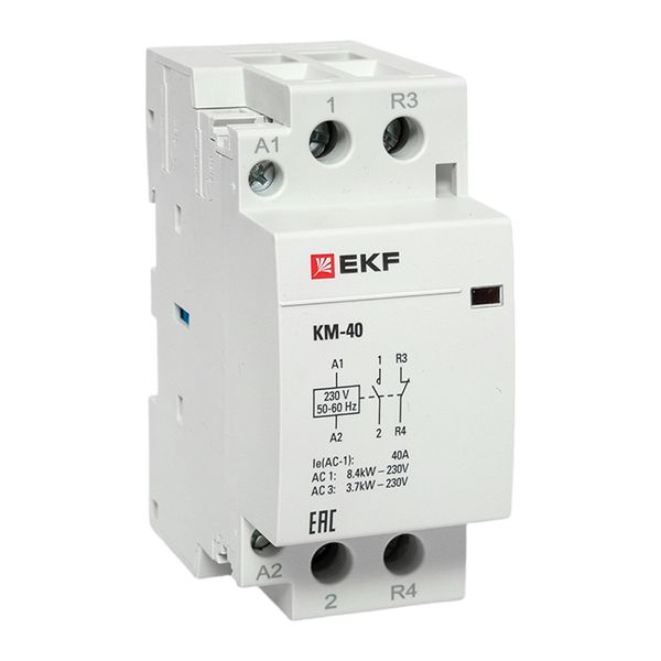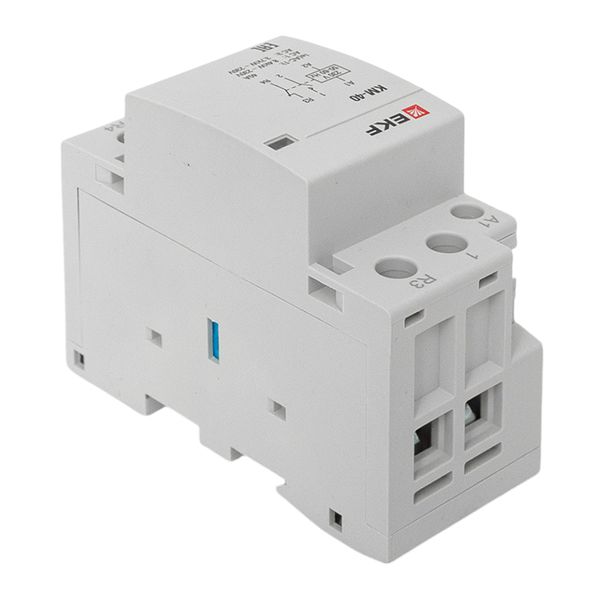 Модульные контакторы представляют из себя контактор в классическом корпусе модульного оборудования. Он состоит из неподвижных контактов, подвижных контактов, которые закреплены в подвижной части магнитной системы. Неподвижная часть магнитной системы закреплена жестко в корпусе КМ. Пружина препятствует смыканию контактов. При подаче напряжения на катушку управления в магнитной системе контактора возникает магнитное поле, которое, преодолевая сопротивление пружины, смыкает магнитную систему и замыкает контакты. При отключении напряжения с катушки управления пружина размыкает контакты. Возможна коммутация алюминиевым и медным проводом.