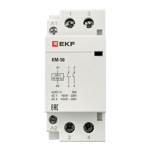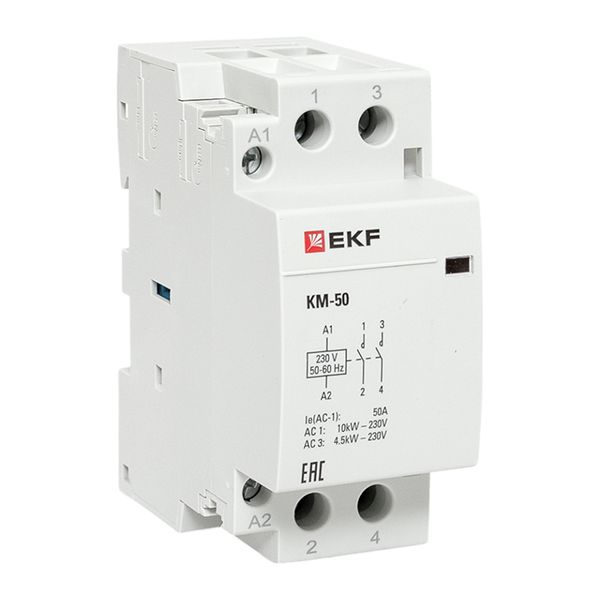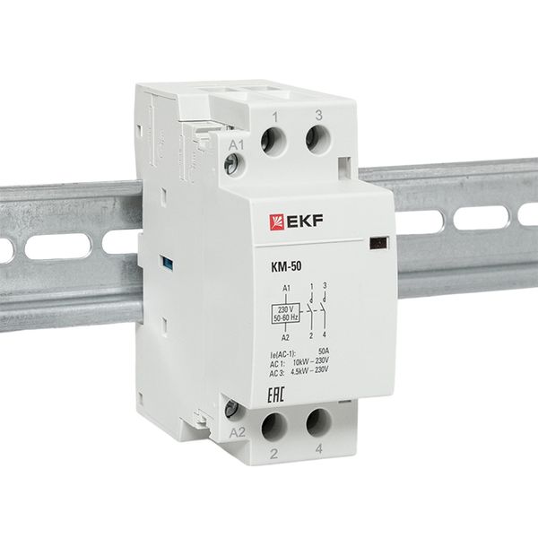 Модульные контакторы представляют из себя контактор в классическом корпусе модульного оборудования. Он состоит из неподвижных контактов, подвижных контактов, которые закреплены в подвижной части магнитной системы. Неподвижная часть магнитной системы закреплена жестко в корпусе КМ. Пружина препятствует смыканию контактов. При подаче напряжения на катушку управления в магнитной системе контактора возникает магнитное поле, которое, преодолевая сопротивление пружины, смыкает магнитную систему и замыкает контакты. При отключении напряжения с катушки управления пружина размыкает контакты. Возможна коммутация алюминиевым и медным проводом.