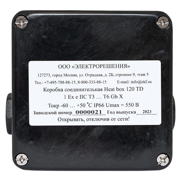 Коробка Heat box 120 TD предназначена для подключения датчиков температуры и кабелей управления Коробка устанавливается непосредственно на трубопроводе и может применяться с тепловой изоляцией толщиной до 120 мм. Датчики температуры вводятся под тепловую изоляцию без применения дополнительных устройств. Применяемые клеммные наборы позволяют выполнить подключение многожильных или одножильных кабелей сечением от 0,5 до 2,5 мм².