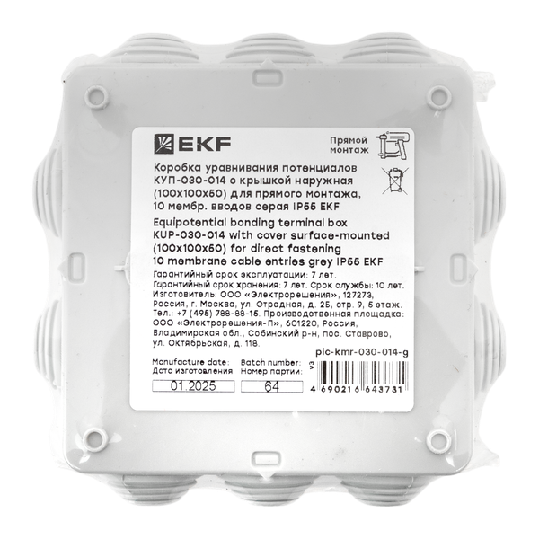 Распределительная коробка уравнивания потенциалов предназначена для соединения проводов заземления дополнительной системы уравнивания потенциалов с заземляющим устройством защитного заземления и защиты данного соединения от механических повреждения, проникновения влаги и пыли. Система дополнительного уравнивания потенциалов необходима для соединения доступных для прикосновения поверхностей электроприборов и сторонние проводящие части, такие как газовые колонки, ванны, система вентиляции, кабеленесущие лотки, трубы водоснабжения, водоотведения и отопления и т.д. Коробка включает в себя специальную шину для соединения проводов заземления. Монтаж коробки осуществляется с помощью монтажного пистолета по технологии прямого монтажа. Распределительная коробка уравнивания потенциалов EKF может быть использована для организации системы дополнительного заземления в квартирах, частных домах, офисах, торговых, общественных и промышленных помещениях.