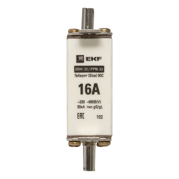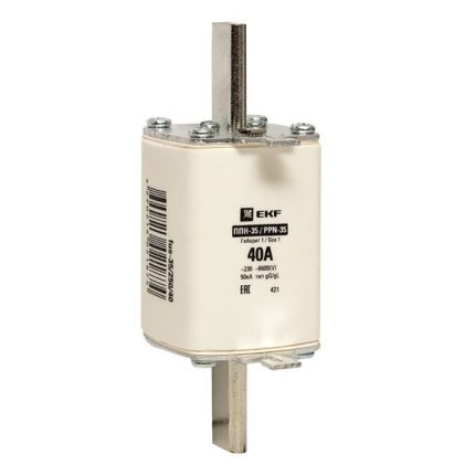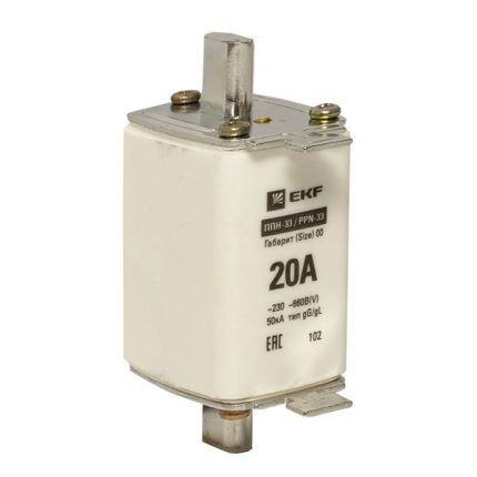 Плавкая вставка ППН-33 100/ 16А габарит 00С EKF. Предохранители плавкие ППН EKF, укомплектованные плавкими вставками типа gG/gL, предназначаются для защиты кабельных линий и промышленных электроустановок от токов перегрузки и короткого замыкания. Предохранители применяются в электрических сетях переменного тока частотой 50 Гц с напряжением до 660В. Применяются для крепления в распределительных и вводно-распределительных устройствах. Предохранители плавкие ППН могут устанавливаться в основание с держателем, а также в специально предназначенные рубильники. В комплект поставки предохранителей плавких ППН основание с держателем не входит и приобретается отдельно.
