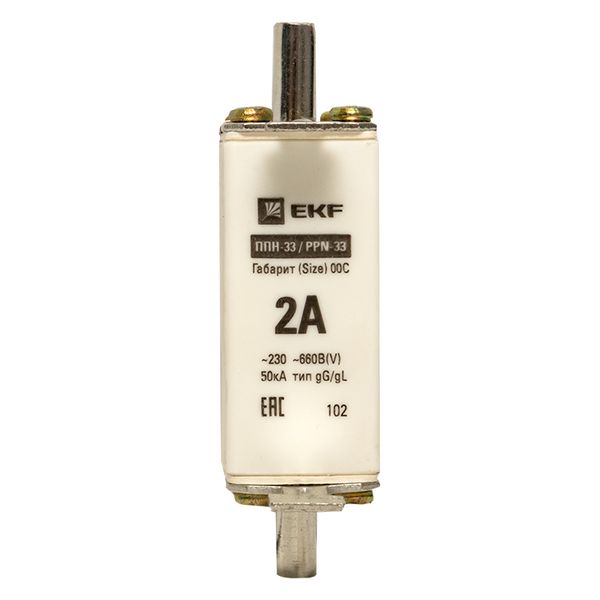 Плавкая вставка ППН-33 100/ 2А габарит 00С EKF. Предохранители плавкие ППН EKF, укомплектованные плавкими вставками типа gG/gL, предназначаются для защиты кабельных линий и промышленных электроустановок от токов перегрузки и короткого замыкания. Предохранители применяются в электрических сетях переменного тока частотой 50 Гц с напряжением до 660В. Применяются для крепления в распределительных и вводно-распределительных устройствах. Предохранители плавкие ППН могут устанавливаться в основание с держателем, а также в специально предназначенные рубильники. В комплект поставки предохранителей плавких ППН основание с держателем не входит и приобретается отдельно.
