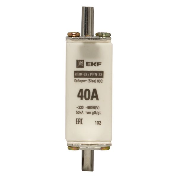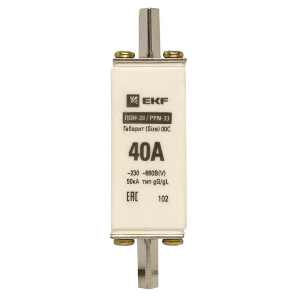 Плавкая вставка ППН-33 100/ 40А габарит 00С EKF. Предохранители плавкие ППН EKF, укомплектованные плавкими вставками типа gG/gL, предназначаются для защиты кабельных линий и промышленных электроустановок от токов перегрузки и короткого замыкания. Предохранители применяются в электрических сетях переменного тока частотой 50 Гц с напряжением до 660В. Применяются для крепления в распределительных и вводно-распределительных устройствах. Предохранители плавкие ППН могут устанавливаться в основание с держателем, а также в специально предназначенные рубильники. В комплект поставки предохранителей плавких ППН основание с держателем не входит и приобретается отдельно.