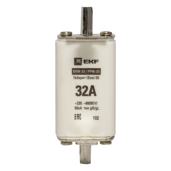 Плавкая вставка ППН-33 160/ 32А габарит 00 EKF. Предохранители плавкие ППН EKF, укомплектованные плавкими вставками типа gG/gL, предназначаются для защиты кабельных линий и промышленных электроустановок от токов перегрузки и короткого замыкания. Предохранители применяются в электрических сетях переменного тока частотой 50 Гц с напряжением до 660В. Применяются для крепления в распределительных и вводно-распределительных устройствах. Предохранители плавкие ППН могут устанавливаться в основание с держателем, а также в специально предназначенные рубильники. В комплект поставки предохранителей плавких ППН основание с держателем не входит и приобретается отдельно.
