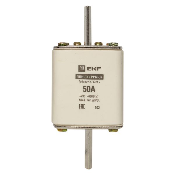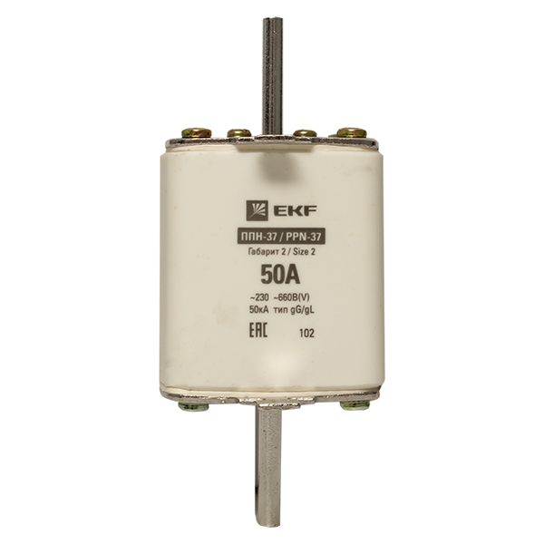 Плавкая вставка ППН-37 400/50А габарит 2 EKF. Предохранители плавкие ППН EKF, укомплектованные плавкими вставками типа gG/gL, предназначаются для защиты кабельных линий и промышленных электроустановок от токов перегрузки и короткого замыкания. Предохранители применяются в электрических сетях переменного тока частотой 50 Гц с напряжением до 660В. Применяются для крепления в распределительных и вводно-распределительных устройствах. Предохранители плавкие ППН могут устанавливаться в основание с держателем, а также в специально предназначенные рубильники. В комплект поставки предохранителей плавких ППН основание с держателем не входит и приобретается отдельно.