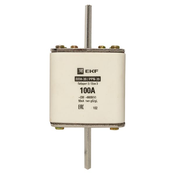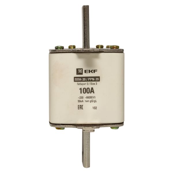 Плавкая вставка ППН-39 630/100А габарит 3 EKF. Предохранители плавкие ППН EKF, укомплектованные плавкими вставками типа gG/gL, предназначаются для защиты кабельных линий и промышленных электроустановок от токов перегрузки и короткого замыкания. Предохранители применяются в электрических сетях переменного тока частотой 50 Гц с напряжением до 660В. Применяются для крепления в распределительных и вводно-распределительных устройствах. Предохранители плавкие ППН могут устанавливаться в основание с держателем, а также в специально предназначенные рубильники. В комплект поставки предохранителей плавких ППН основание с держателем не входит и приобретается отдельно.
