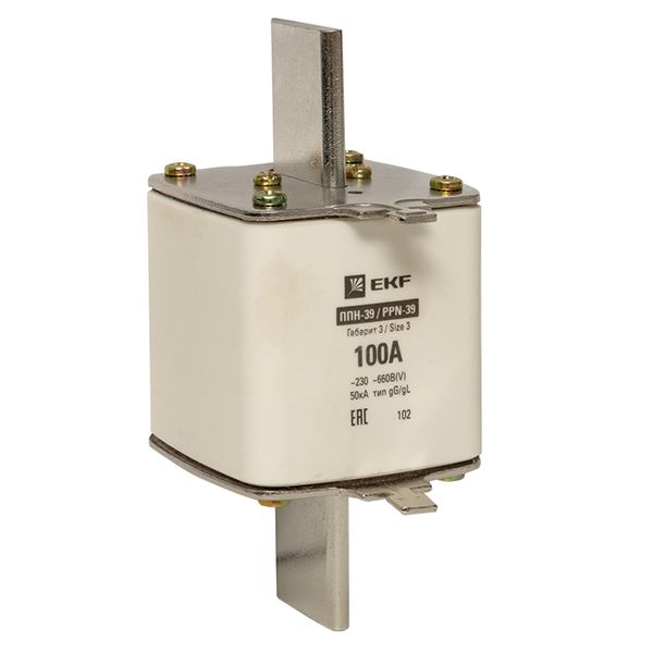 Плавкая вставка ППН-39 630/100А габарит 3 EKF. Предохранители плавкие ППН EKF, укомплектованные плавкими вставками типа gG/gL, предназначаются для защиты кабельных линий и промышленных электроустановок от токов перегрузки и короткого замыкания. Предохранители применяются в электрических сетях переменного тока частотой 50 Гц с напряжением до 660В. Применяются для крепления в распределительных и вводно-распределительных устройствах. Предохранители плавкие ППН могут устанавливаться в основание с держателем, а также в специально предназначенные рубильники. В комплект поставки предохранителей плавких ППН основание с держателем не входит и приобретается отдельно.