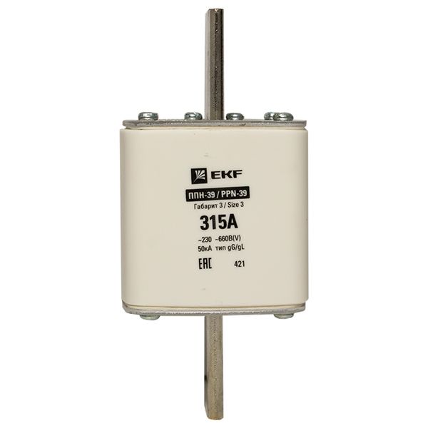 Плавкая вставка ППН-39 630/315А габарит 3 EKF. Предохранители плавкие ППН EKF, укомплектованные плавкими вставками типа gG/gL, предназначаются для защиты кабельных линий и промышленных электроустановок от токов перегрузки и короткого замыкания. Предохранители применяются в электрических сетях переменного тока частотой 50 Гц с напряжением до 660В. Применяются для крепления в распределительных и вводно-распределительных устройствах. Предохранители плавкие ППН могут устанавливаться в основание с держателем, а также в специально предназначенные рубильники. В комплект поставки предохранителей плавких ППН основание с держателем не входит и приобретается отдельно.