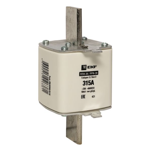 Плавкая вставка ППН-39 630/315А габарит 3 EKF. Предохранители плавкие ППН EKF, укомплектованные плавкими вставками типа gG/gL, предназначаются для защиты кабельных линий и промышленных электроустановок от токов перегрузки и короткого замыкания. Предохранители применяются в электрических сетях переменного тока частотой 50 Гц с напряжением до 660В. Применяются для крепления в распределительных и вводно-распределительных устройствах. Предохранители плавкие ППН могут устанавливаться в основание с держателем, а также в специально предназначенные рубильники. В комплект поставки предохранителей плавких ППН основание с держателем не входит и приобретается отдельно.