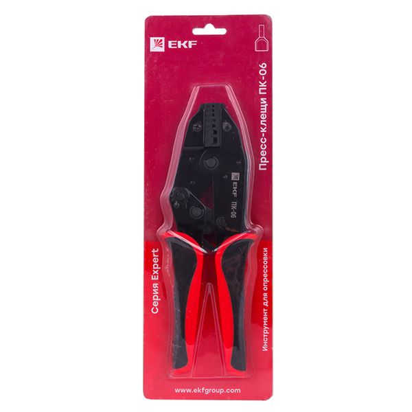 Пресс-клещи pk-06-exp предназначены для НШВИ наконечников сечением 2х0,5-2х6 мм2. Инструмент оснащен храповым механизмом с автоматической разблокировкой по завершению цикла опрессовки. Каждая модель имеет маркировку, указывающую значение сечения используемого наконечника или разъема, а также нанесенную цветовую маркировку, соответствующую цвету изолирующей манжеты. Профиль опрессовки — трапеция.