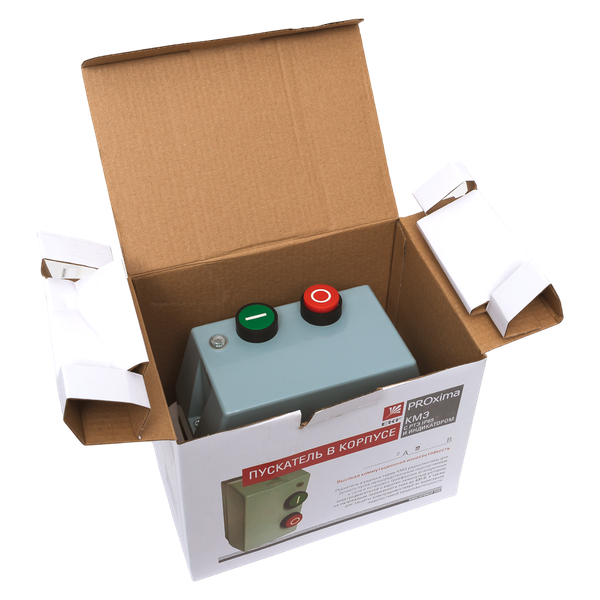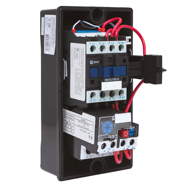 Пускатель магнитный КМЭ EKF PROxima является комплектным устройством, состоящим из малогабаритного контактора КМЭ, теплового реле РТЭ, оболочки с сальниками и кнопок управления. Пускатели предназначены для дистанционного пуска непосредственным подключением к сети и остановки трехфазных асинхронных электродвигателей с короткозамкнутым ротором на напряжение переменного тока до 400 В, а также для защиты электродвигателей от перегрузок недопустимой продолжительности и сверхтоков, возникающих при обрыве одной из фаз. При применении контакторов КМЭ 0910 – КМЭ 3210 используется пластиковый корпус, контакторов КМЭ 4011 – КМЭ 9511 – металлическая оболочка.
