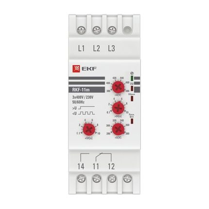 Многофункциональное реле контроля фаз PROxima является устройством, созданным на базе микроконтроллера. Реле применяется в системах автоматизации и предназначено для высокоточного контроля качества питания сети в электроустановках до 1000 В переменного тока трехфазной сети. Реле контролирует следующие параметры: • отсутствие фаз; • падение напряжения (кроме rkf-11, rkf-31); • повышение напряжения (кроме rkf-11, rkf-31); • асимметрия напряжения с выдержкой времени срабатывания (кроме rkf-11, rkf-34, rkf-31); • чередование фаз;