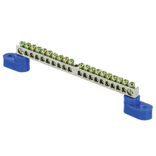 Главная Щиты, корпуса и комплектующие Шина заземления/нулевая для распределительного щита Шина «0» N (6×9мм) 20 отв. цинк 2 синих угловых изолятора EKF PROxima