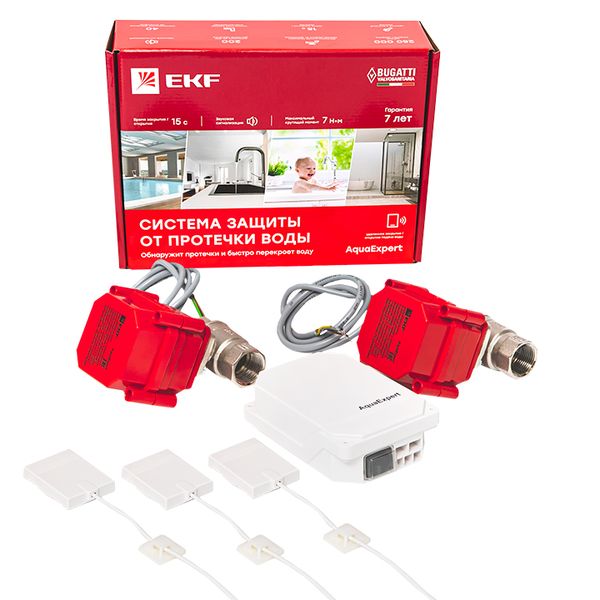 Система AquaExpert предназначена для автоматического отключения подачи воды и выдачи звукового оповещения при возникновении протечек воды в системах водоснабжения, отопления и канализации. При попадании воды на датчик блок управления выдаст сигнал на шаровые электроприводы для отключения подачи воды. Датчики протечки воды устанавливаются в местах вероятного появления воды: ванные комнаты, кухни, санузлы, душевые и тд.