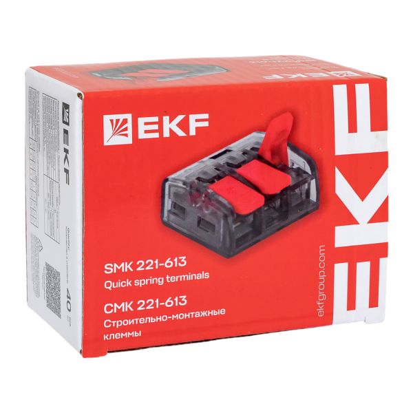 Клеммы СМК-221 EKF стали результатом развития классической серии СМК-222 и выделяются на российском рынке своим уникальным дизайном. Изделия предназначены для присоединения и ответвления одножильных и многожильных проводов сечением до 6 мм2 в цепях переменного тока до 400В. Клеммы СМК-221 отличаются повышенной прочностью и рассчитаны на многократное использование. Кроме того, новые клеммы можно использовать при температуре от –40 до +40° C и относительной среднегодовой влажности 60% при температуре 20° C. Новые надежные клеммы СМК-221, которые заметно облегчают процесс монтажа проводки, предназначены для электриков и строителей. Во избежание перегрева в одну клемму предусматривается подключение проводов одного сечения.