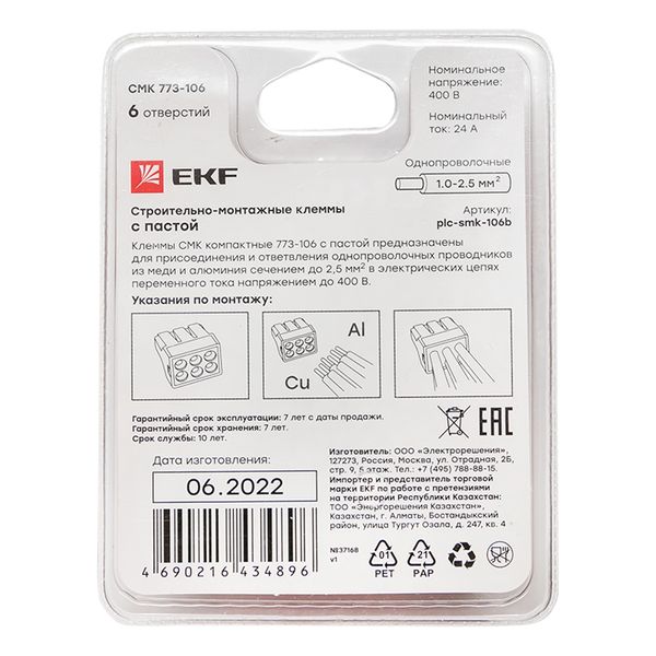 Каждая упаковка содержит по пять клемм. Прочный пластик дает дополнительную защиту изделиям, а лаконичный дизайн с яркими цветами выгодно выделяется на полках магазинов. Антивандальная упаковка полностью запаяна, что исключит ее несанкционированное вскрытие в магазине. Клеммы СМК с пастой EKF предназначены для присоединения и ответвления одножильных проводников из меди и алюминия или многожильного медного провода с наконечником в электрических цепях переменного тока с частотой 50 Гц напряжением до 400 В. Контактная паста автоматически снимает окисную пленку с алюминиевых проводов и предохраняет их от повторного окисления. Клеммы можно использовать при температуре от –40 до +40° C.