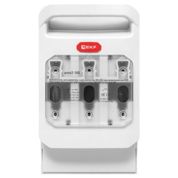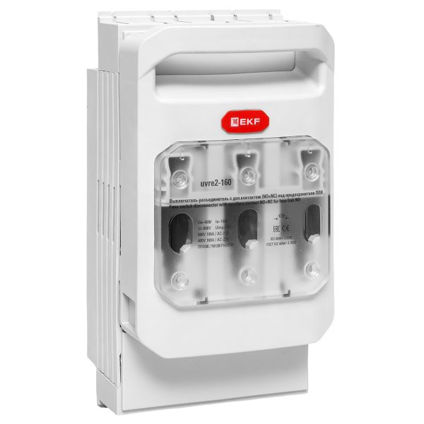 Выключатели-разъединители УВРЭ v2 с дополнительным контактом (NO+NC) откидного типа под предохранители ППН EKF (далее — УВРЭ v2) предназначены для ручного включения-отключения и для защиты от коротких замыканий и перегрузки цепей переменного тока номинальным напряжением до 690В частотой 50Гц (предохранители в комплект поставки не включены). Применяются в вводно-распределительных устройствах, распределительных и шкафах управления и др. Видимый разрыв обеспечивается благодаря откидной крышке, оснащенной держателями предохранителей. При открывании крышки происходит разрыв цепи (первый разрыв происходит в верхней части). Она также выполняет функцию фронтальной защиты от прикосновений.