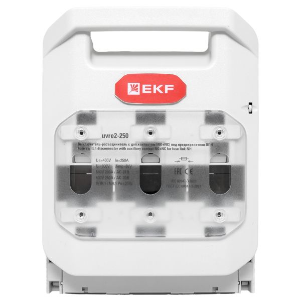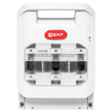 Выключатели-разъединители УВРЭ v2 с дополнительным контактом (NO+NC) откидного типа под предохранители ППН EKF (далее — УВРЭ v2) предназначены для ручного включения-отключения и для защиты от коротких замыканий и перегрузки цепей переменного тока номинальным напряжением до 690В частотой 50Гц (предохранители в комплект поставки не включены). Применяются в вводно-распределительных устройствах, распределительных и шкафах управления и др. Видимый разрыв обеспечивается благодаря откидной крышке, оснащенной держателями предохранителей. При открывании крышки происходит разрыв цепи (первый разрыв происходит в верхней части). Она также выполняет функцию фронтальной защиты от прикосновений.